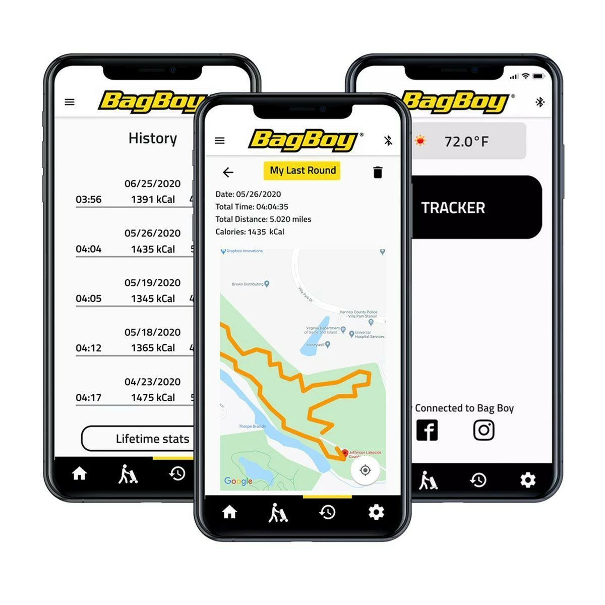 The Bag Boy Tracker not only tracks distance, like a GPS map app may record, but also estimated calories burned and elapsed play time. Additionally, the Bag Boy Tracker uses both smartphone GPS Location data in conjunction with cart wheel rotations recorded by the physical device in order to generate a more accurate distance recording than GPS data alone.