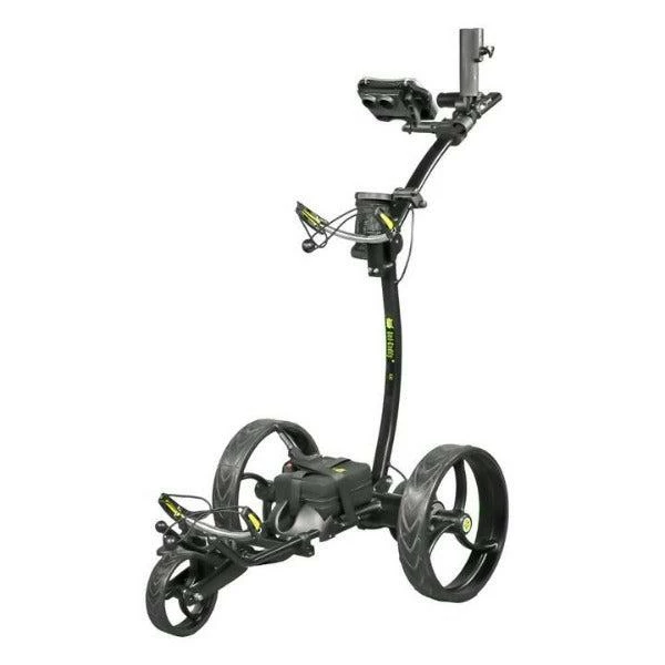 The X8R™ features a pair of powerful and quiet 12V 200 Watt DC electric motors, inconspicuously hidden and protected in a small diameter aluminum tube. No external gear boxes like many other trolleys Bat-Caddy uses direct drive motors. Also the caddy will master almost any hill (30+ degrees climbing ability) and reaches a top speed of 5.5 mph+.